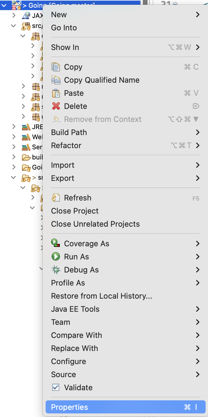 프로젝트를 우클릭 -> Build Path -> Configure Build Path로 들어가줍니다.
