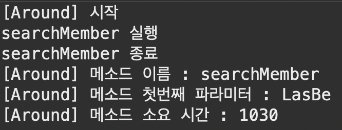 메소드 전, 후로 Around 어드바이스가 잘 적용되어 출력된 것을 확인할 수 있습니다.