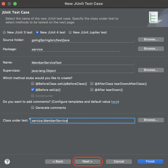 JUnit Test Case๋ฅผ ๊ฒ์ํด์ฃผ๊ณ next๋ฅผ ํด๋ฆญํฉ๋๋ค.