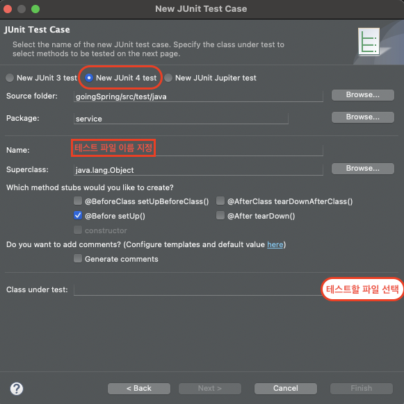 New JUnit 4 test๋ฅผ ์ ํํ๊ณ