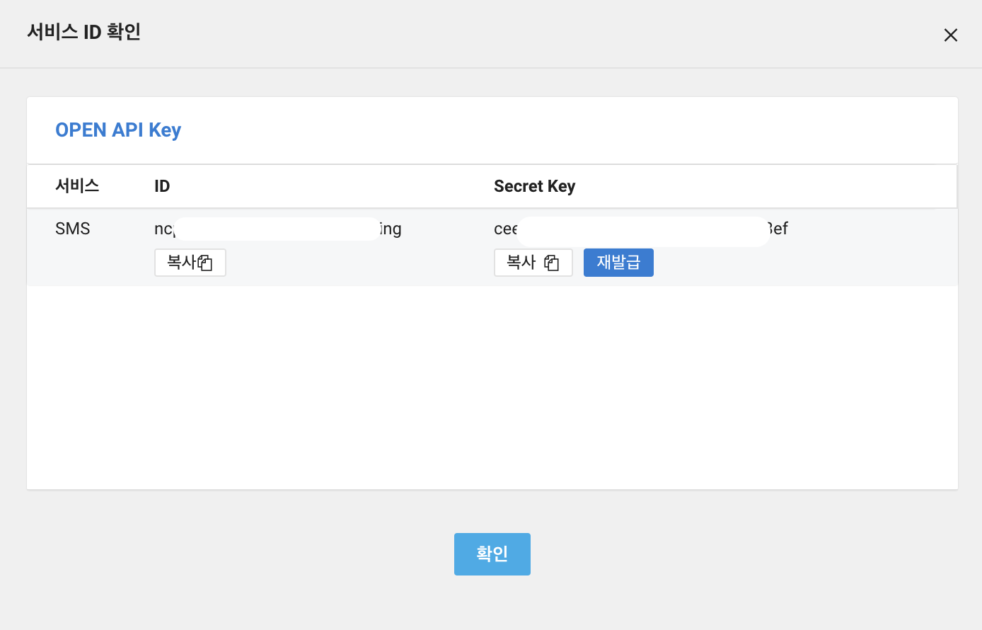 - 열쇠 모양을 클릭해 서비스 ID를 확인할 수 있습니다.