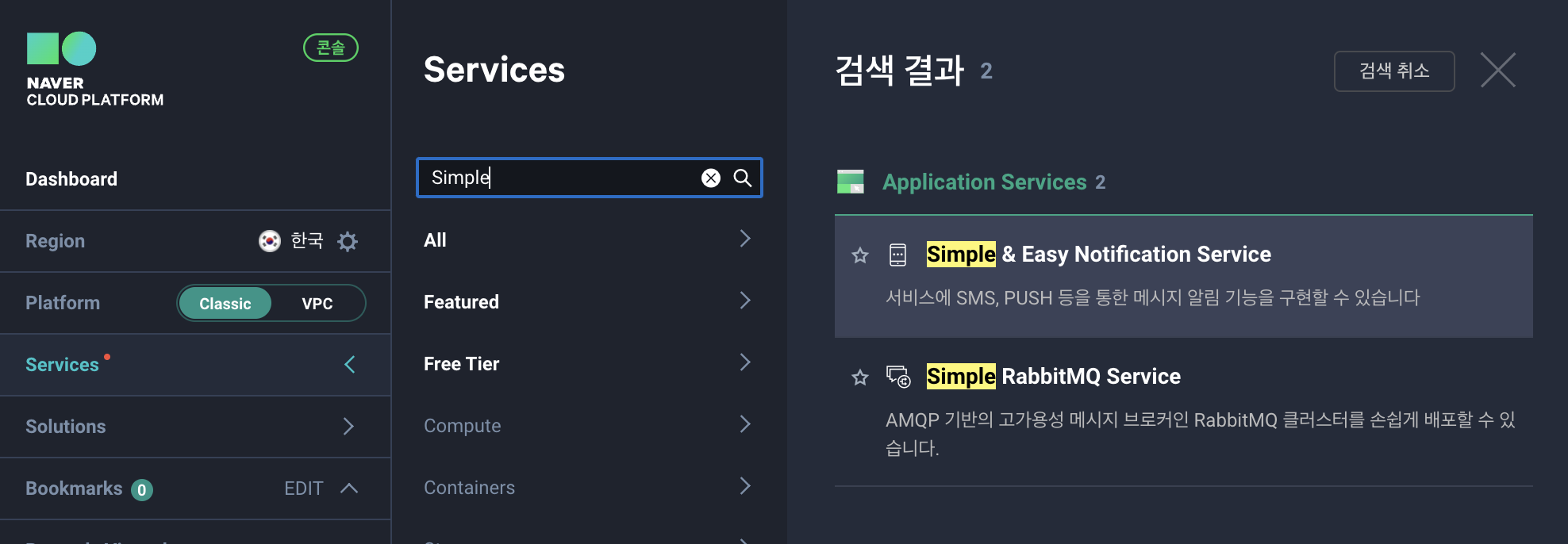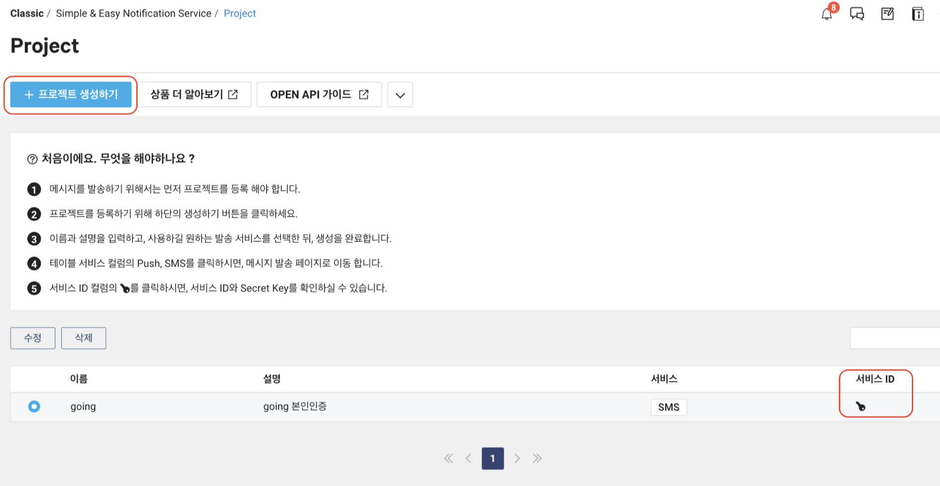 - Service 메뉴에서 SENS를 검색해주고 프로젝트를 생성합니다.