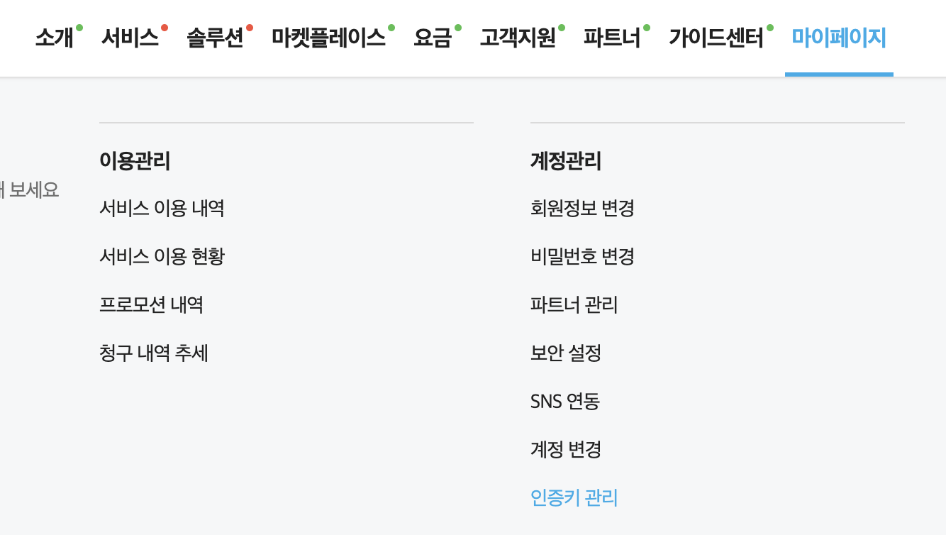 - 마이페이지 -> 인증키 관리로 들어가줍니다.