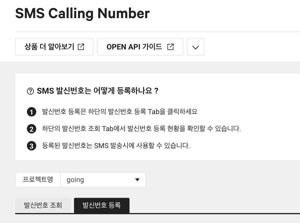 - 프로젝트 선택 -> 발신번호 등록 탭 선택
