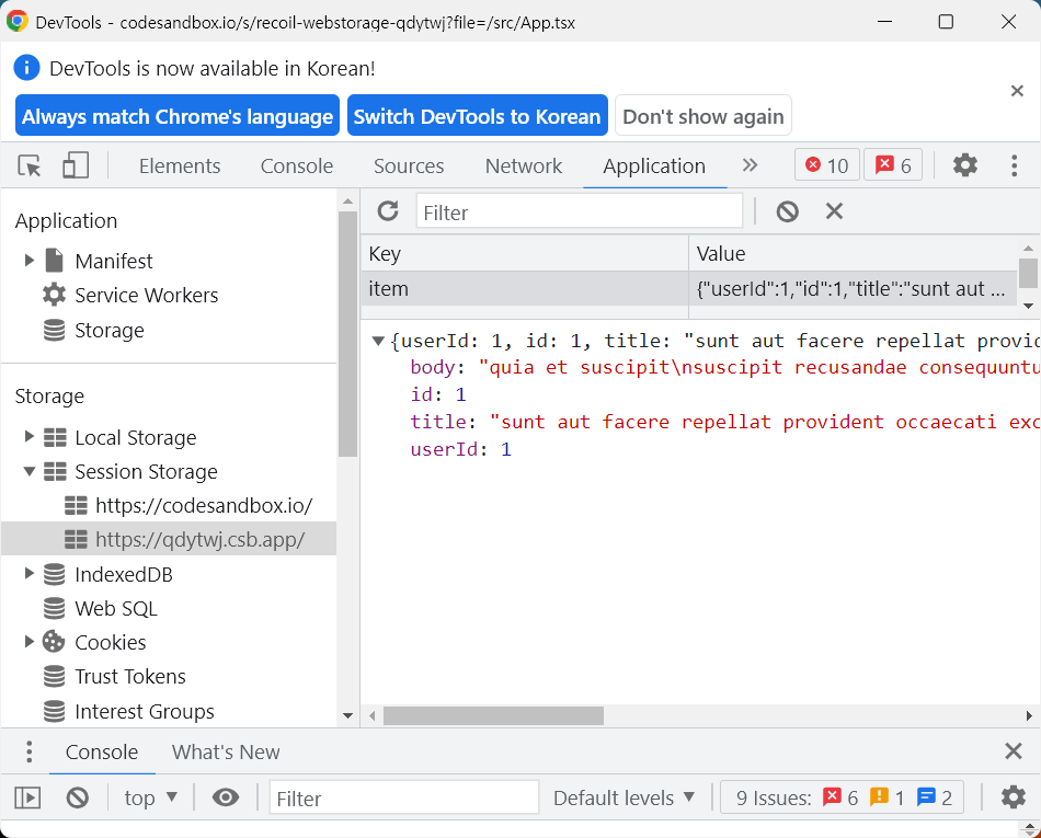 개발자 도구 > Application > Session Storage/Local Storage에서 확인할 수 있습니다.