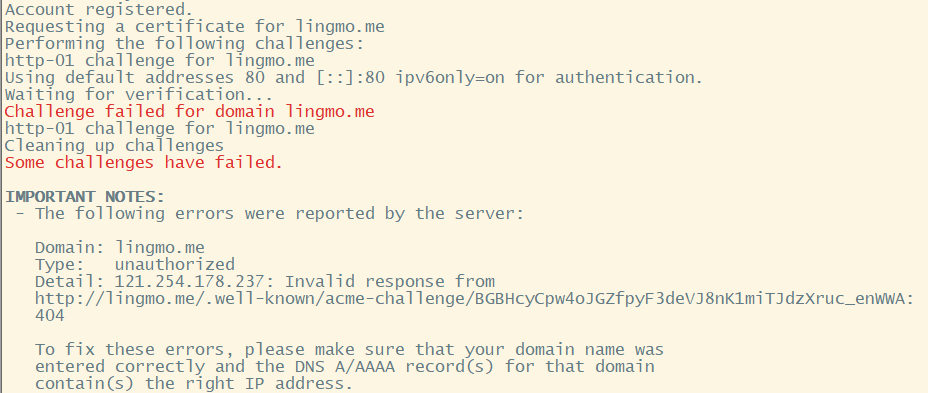 Challenge failed for domain / Some challenges have failedTo fix these errors, please make sure that your domain name was