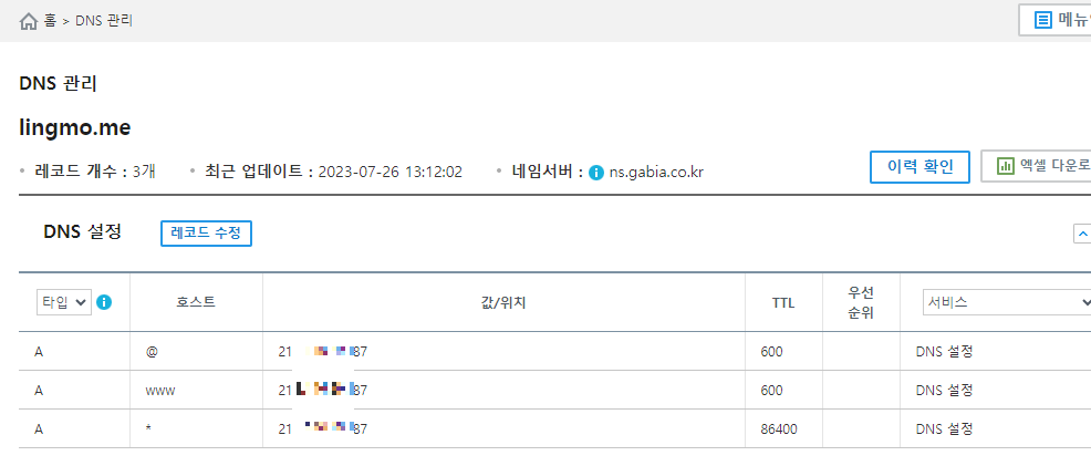 도메인 제공 업체에서 DNS A 레코드를 수정해줍니다.