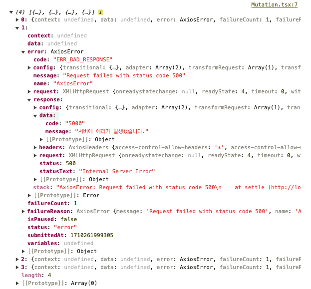 ์์๋ก ์๋ฒฝํ์ง ์์ง๋ง ์ ๊ฐ ErrorBoundary๋ฅผ ํ ์คํธํ ๋ ์ฌ์ฉํ๋ ์ฝ์์ ์ฐ์ด๋ณด๋ฉด ๋ค์๊ณผ ๊ฐ์ด ์บ์ ๋ mutation data๋ฅผ ํ์ธํ ์ ์์ต๋๋ค.