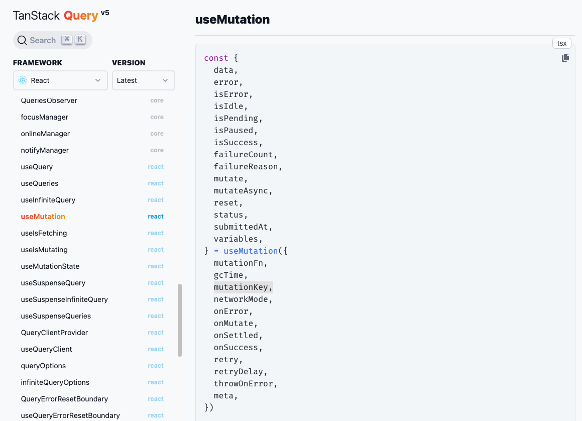 const mutation = useMutation({ mutationKey: ['mutationKey'], mutationFn: updateData });