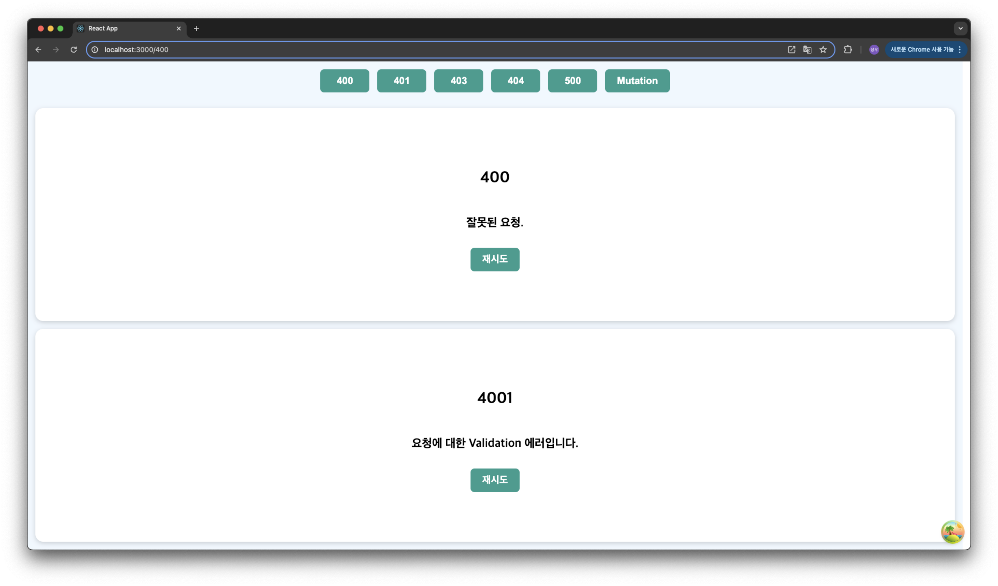 - ErrorBoundary๋ฅผ ํตํ ์ ์ธ์ ์ธ ์๋ฌ ํธ๋ค๋ง, react-query๋ฅผ ์ด์ฉํ ์ฌํธ์ถ ๋ฐฉ๋ฒ