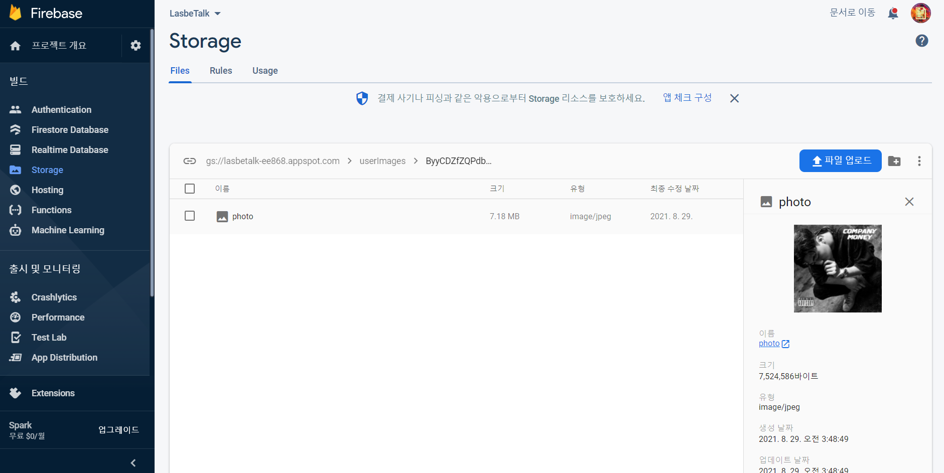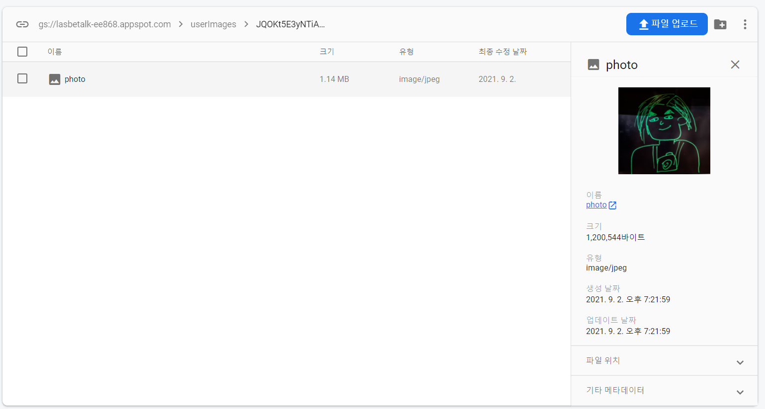 아까 선택한 이미지를 파이어베이스 저장소에 photo라는 이름으로 사진을 저장한다.