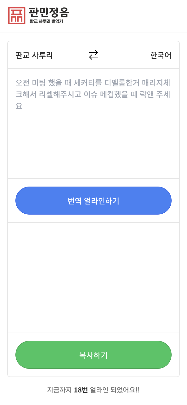 ๋๋ฌด ๊ณจ๋๋ฆฌ๊ณ ์๊ฒจ์ ํ์ฐธ๋์ ์ฌ์ด์ ๋๋ผ๋ค๊ฐ, ์ด๊ฑฐ ๋ฒ์ญ๊ธฐ๋ก ๋ง๋ค๋ฉด ์ฌ๋ฏธ์๊ฒ ๋ค๋ ์๊ฐ์ด ์ค์ณค์ต๋๋ค.