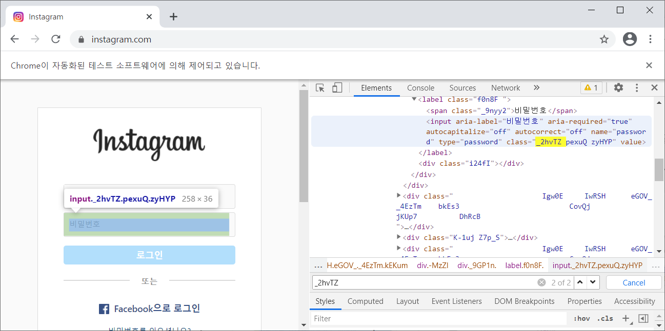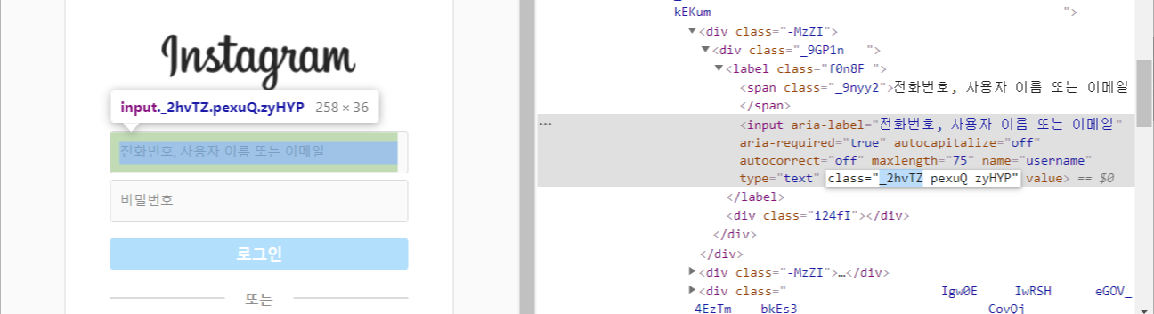 개발자모드를 통해 로그인 칸의 클래스를 유추해본다