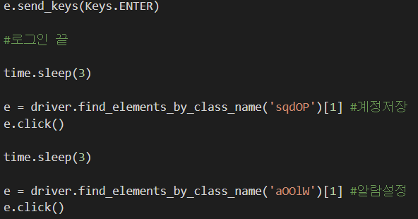 동일한 방식으로 클래스를 찾아주고 e.click()으로 클릭 명령을 내린다.