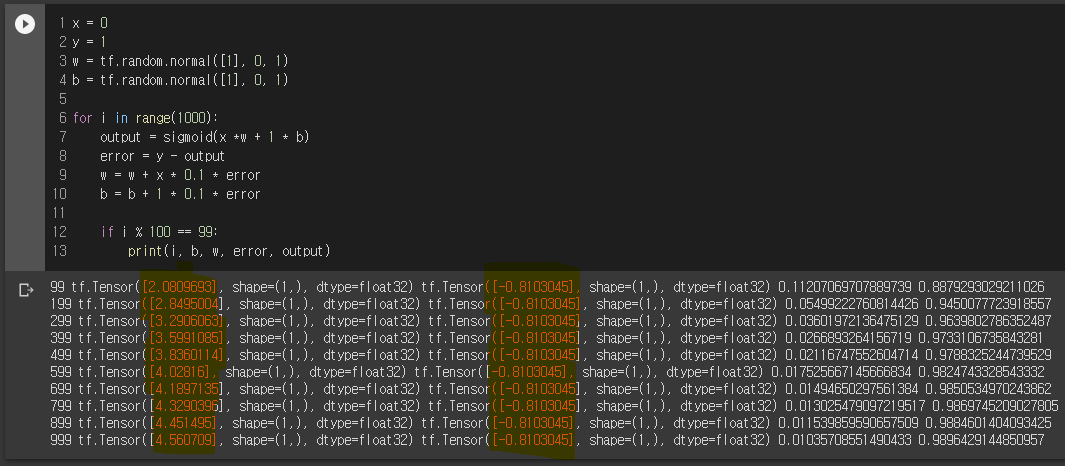 프로그램을 실행한 결과 w값은 그대로인데 반해 b 값은 계속 변하면서 output은 기대출력인 1에 가까워진다.
