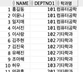 -학생 테이블에서 학과번호가 101인 학생을 컴퓨터공학과 나머지 학과번호를 기타학과로 출력한다.