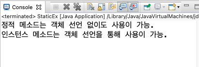 System.out.println("정적 메소드는 객체 선언 없이도 사용이 가능.");