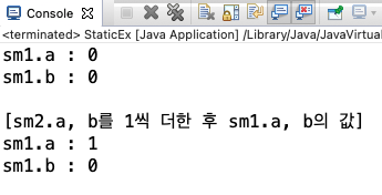 결과를 보면 sc2 객체에서 정적 필드(a)와 인스턴스 필드(b)에 1을 더해주면 sc1의 정적 필드만 1이 증가하는 모습을 볼 수 있다.