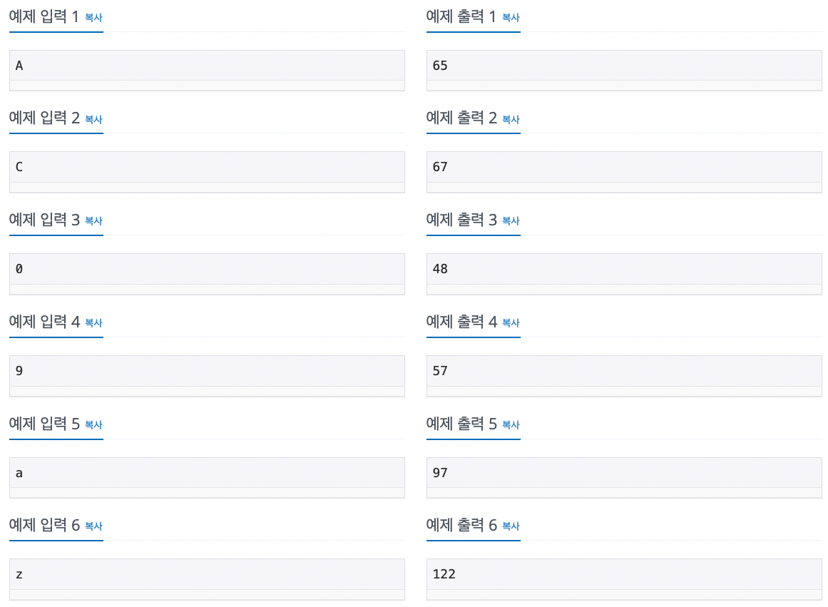입력으로 주어진 글자의 아스키 코드 값을 출력한다.