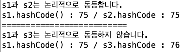 System.out.println("s1.hashCode() : "+s1.hashCode()+" / s3.hashCode : "+s3.hashCode());