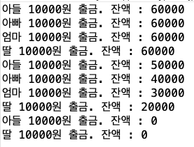 100,000원이 들어있는 계좌에서 가족 4명이 만원씩 출금한다는 가정하에 작성한 코드입니다.