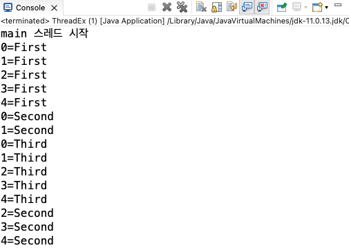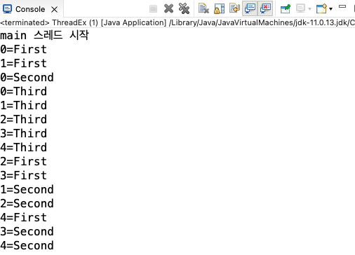 위에서 구현한 클래스를 객체화시키며 3개 쓰레드의 이름을 First, Second, Third로 정해줍니다.
