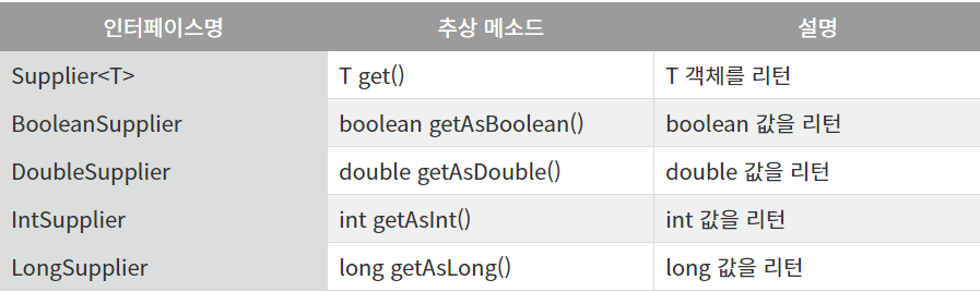 Supplier 인터페이스의 추상 메소드는 get###() 형식으로 통일되어 있습니다.
