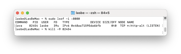 터미널을 킨 후 sudo lsof -i :8080 명령어로 포트에 있는 프로세스를 검색합니다.
