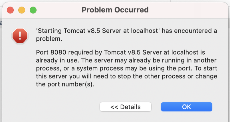 맥, mac, 이클립스, eclipse, 톰캣, tomcat, 8080 port, 8080포트, 8080 포트 충돌, 8080 포트 오류, 8080 port error, starting Tomcat v9.0 server at localhost has endountered a problem