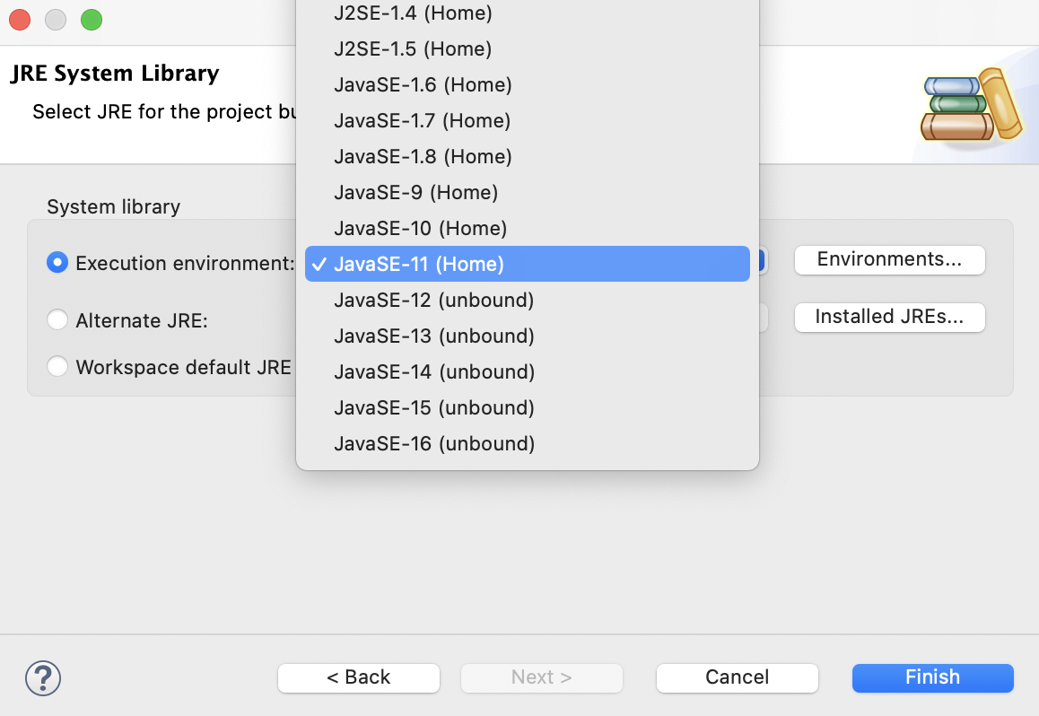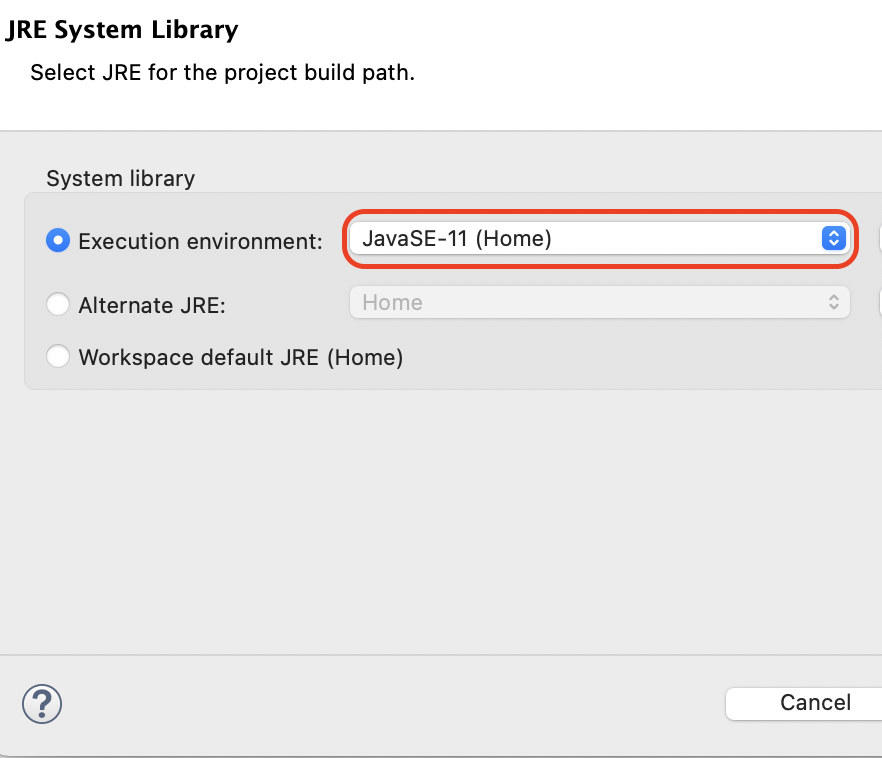 이제 Execution environment의 항목을 클릭한 뒤 본인이 바로 전에 지정한 자바의 버전을 선택 후