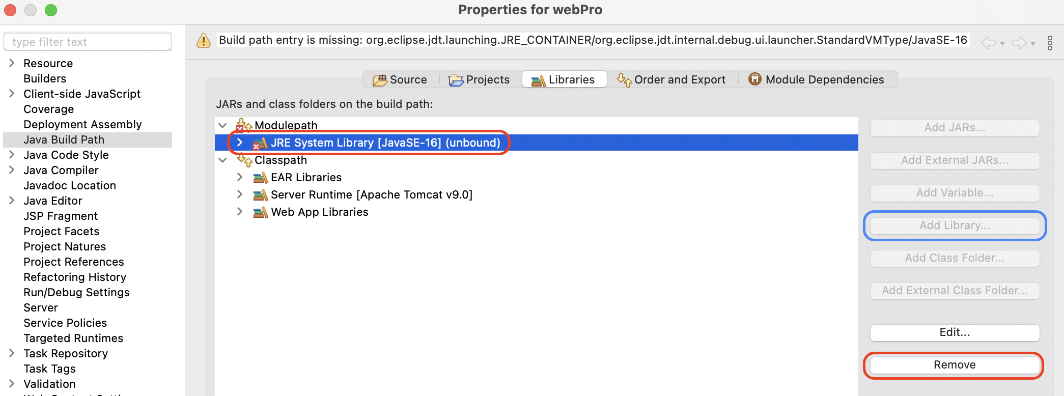 unbound 된 기존 JRE System Library를 삭제해준 뒤 Add Library를 통해 생성창으로 이동합니다.