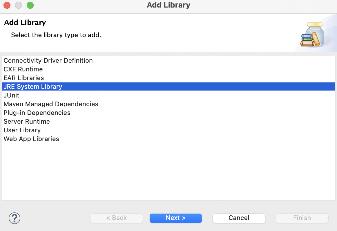JRE System Library를 선택하고 Next를 클릭합니다.