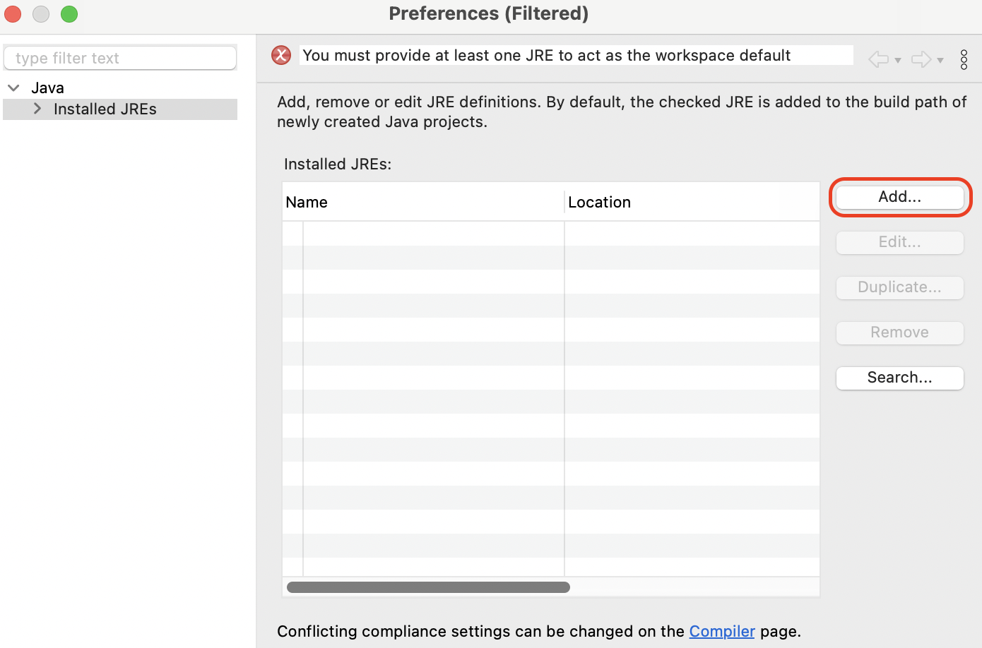 Installed JREs를 클릭한 뒤 기존에 존재하는 JREs를 Remove를 한 뒤 Add를 클릭합니다.