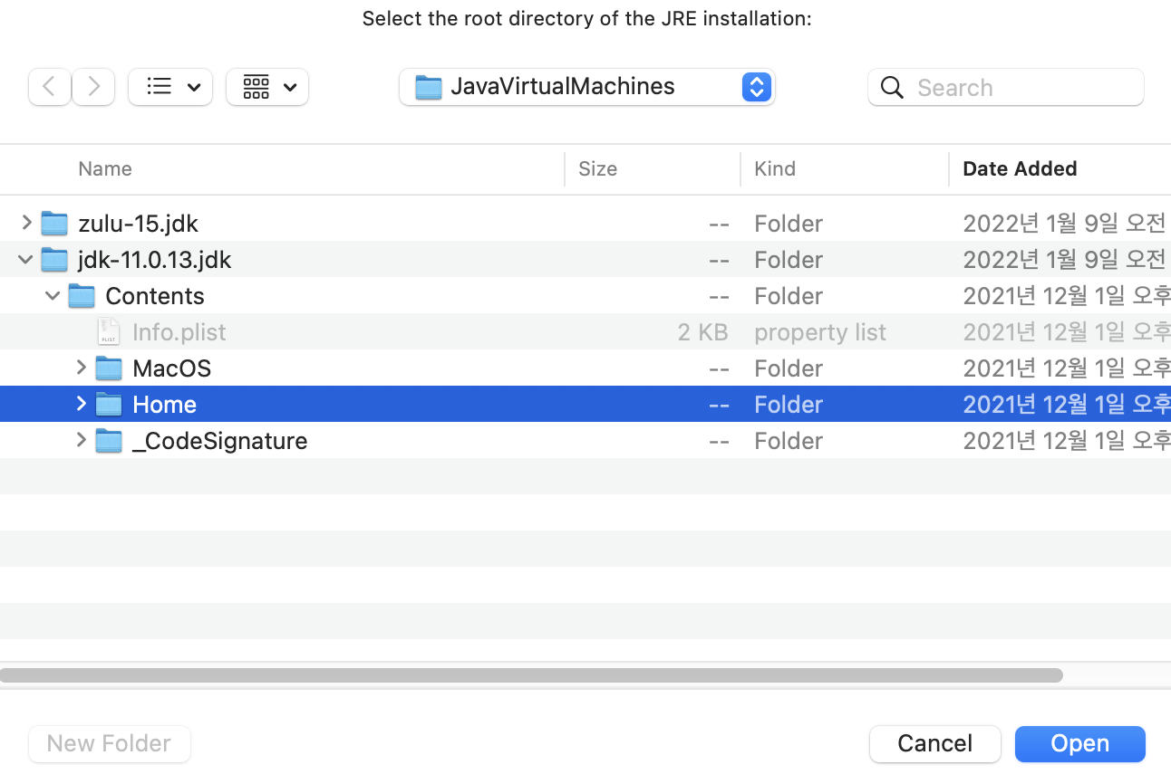 본인이 설치한 자바의 경로에 들어가 원하는 버전의 Home 폴더를 선택 후 Open 해줍니다.