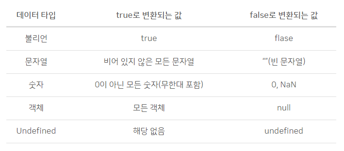 조건문에서 기본적으로 true/false를 리턴하는 요소들은 아래와 같습니다.