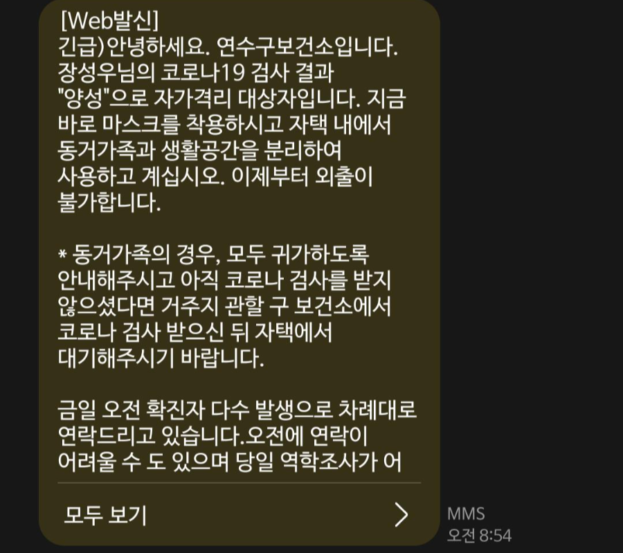 아침부터 보건소에서 확진 판정 문자가 도착했다.