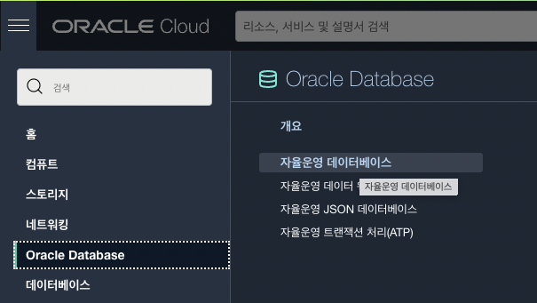 가입이 완료되었다면 메뉴에서 Oracle Database -> 자율운영 데이터베이스로 진입합니다.