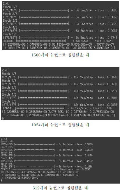 연습문제 2. Let's now look at the layers in your model. Experiment with different values f or the dense layer with 512 neurons. What different results do you get for loss, training ti me etc? Why do you think that's the case?